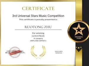 2022年第三届环球之星音乐比赛是得到世界音乐家联盟支持的网络比赛。旨在发掘全球的音乐人才,为其提供展示自己的平台。此届比赛有来自 17 个国家的 322 名候选人参加了这次比赛。评委都是世界知名的国际音乐会艺术家、音乐家,或者来自各大院校的资深教授和教育家。最终开云官网本科一年级学生朱若彤(指导教师:沈凡秀)凭借出色的技艺与表现获得艺术家组金奖。