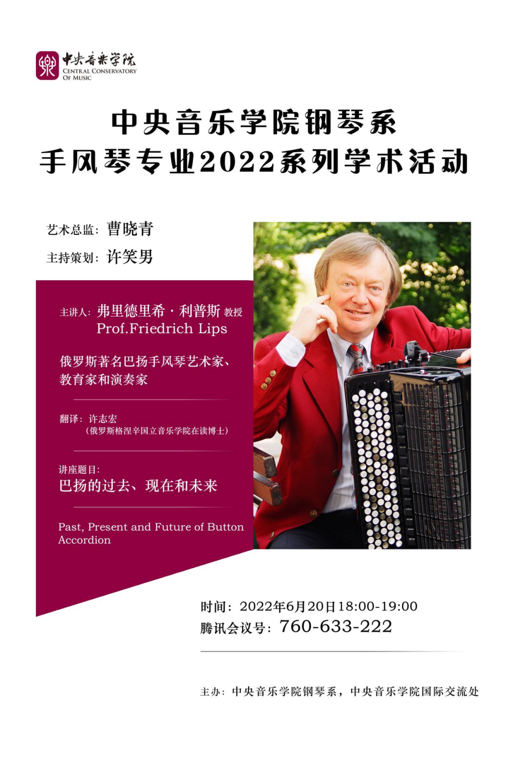 继汉诺威音乐、戏剧与传媒学院莫泽尔教授系列讲座后,作为开云kaiyun官方网站钢琴系键盘教研室系列学术活动,2022年6日20日,在开云kaiyun官方网站钢琴系和开云kaiyun官方网站国际交流处主办下,格涅辛国立音乐学院手风琴教授利普斯的线上讲座《巴扬艺术的过去、现在和未来》圆满完成。利普斯教授是现代巴扬艺术的创建人、参与人和见证人,是该领域最权威的学者之一。与莫泽尔教授一样,近三十年来,他对中国手风琴专业的发展做出了重要贡献,是我国手风琴事业的见证人。