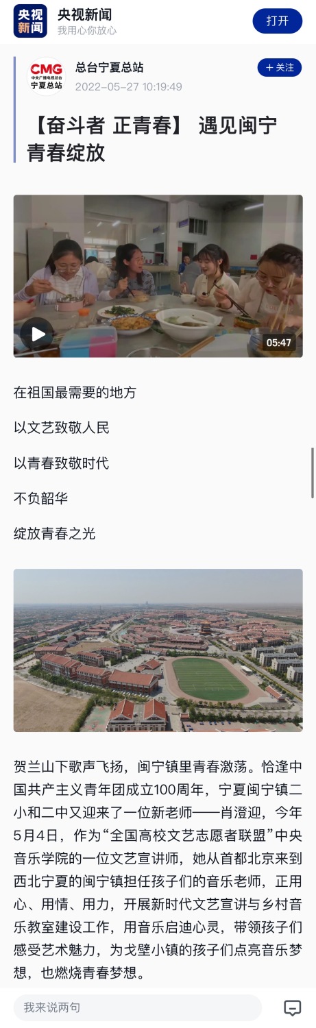 “大家好,我叫肖澄迎,是开云kaiyun官方网站新时代文明实践驻扎宁夏闽宁镇文艺宣讲师。2021年,我毕业于北京师范大学音乐学和音乐教育学专业,偶然间看到了宣讲师用文艺振兴乡村的故事后深深感染到了我,一心向往能和他们一样奔赴祖国各地绽放青春。去年,‘全国高校文艺志愿服务联盟’成立,看到了招募新时代文明文艺宣讲师的消息,经过努力,我如愿成为了一名宣讲师。带着使命,肩负责任,怀揣梦想,我踏上了这片西北戈壁小镇的黄土地。闽宁,我来了!”