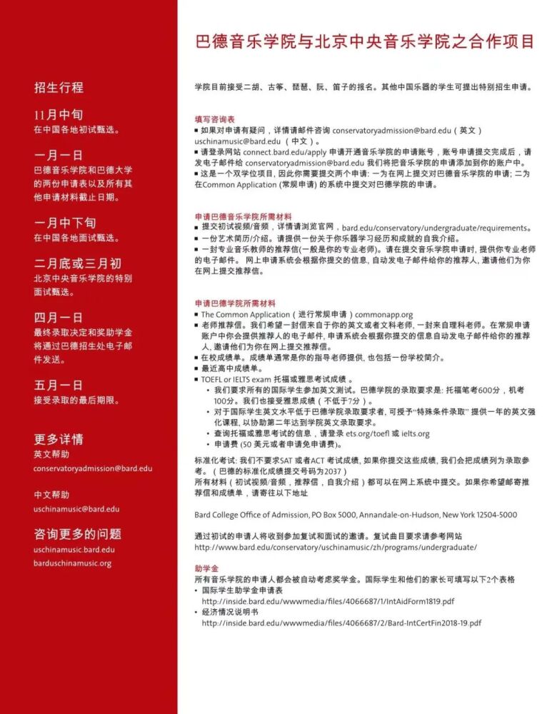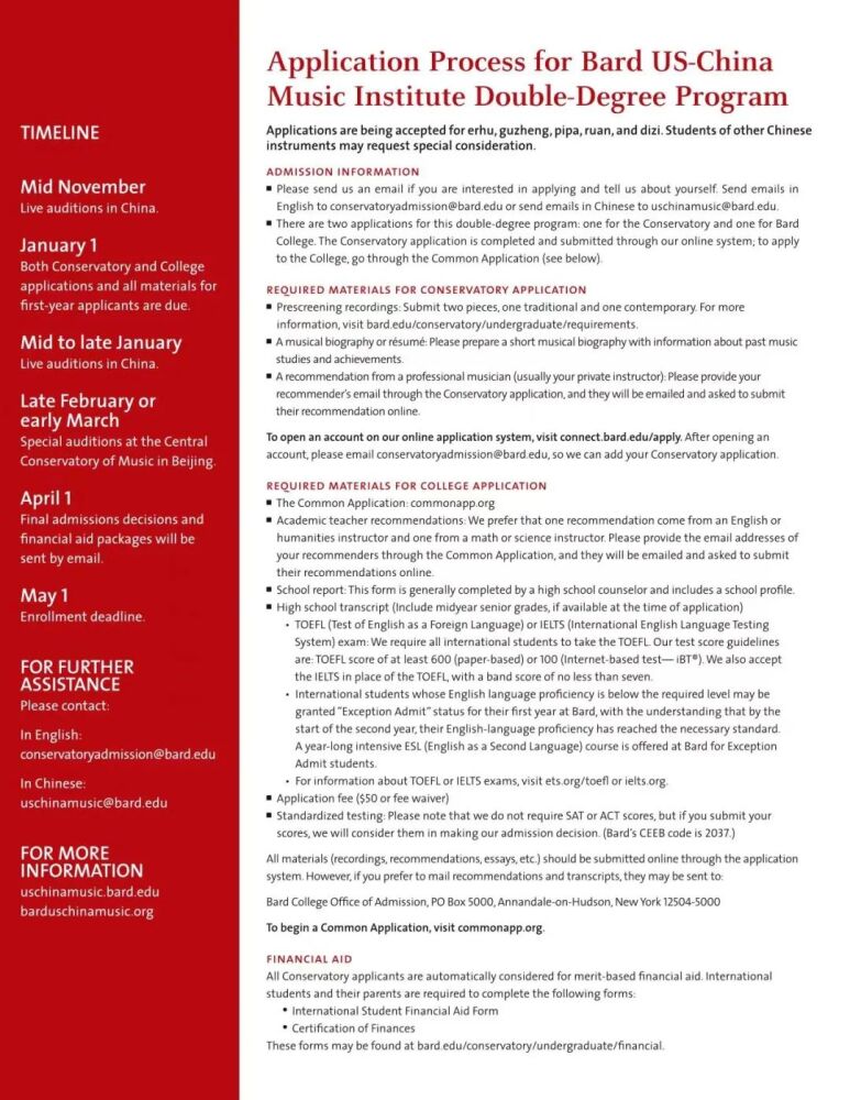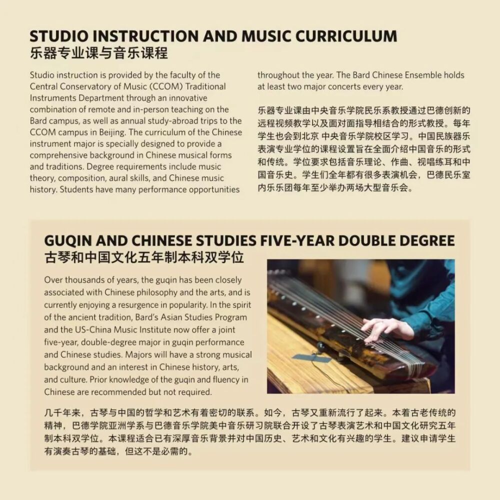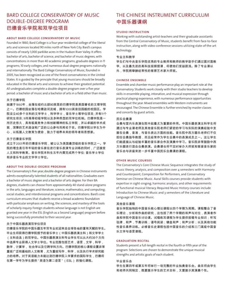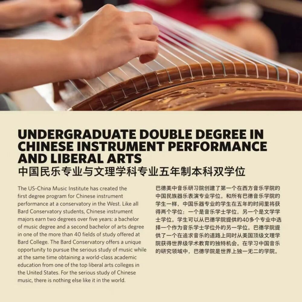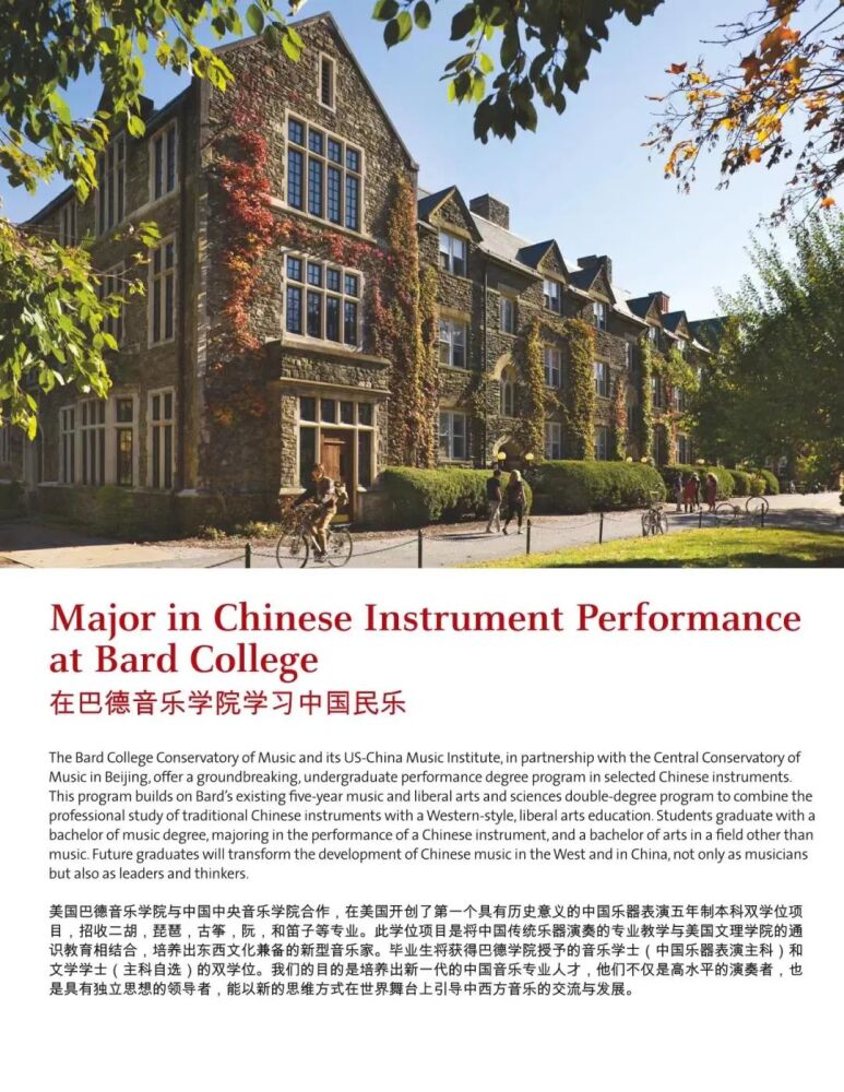 巴德学院始建于1860年,是美国著名的文理学院。成立于2005年的巴德音乐学院,被公认为美国最顶尖的音乐学院之一。与巴德音乐学院的合作项目,旨在将中国器乐演奏的专业教学与美国文理学院的通识教育相结合。招生简章显示,中国乐器表演主课专业学生除器乐演奏专业外可以从大约35个方向中选择专业获得人文学士学位。毕业生将获得巴德学院授予的音乐学士(中国民族器乐表演主科)和文学学士(自选主科)的双学位。在人才培养过程中,开云kaiyun官方网站民乐系充分发挥在中国民族音乐专业教学与演奏方面的学科优势,承担起招生专业考核、乐器专业主课教学、课程设置与教学方案制定等方面的主要工作。