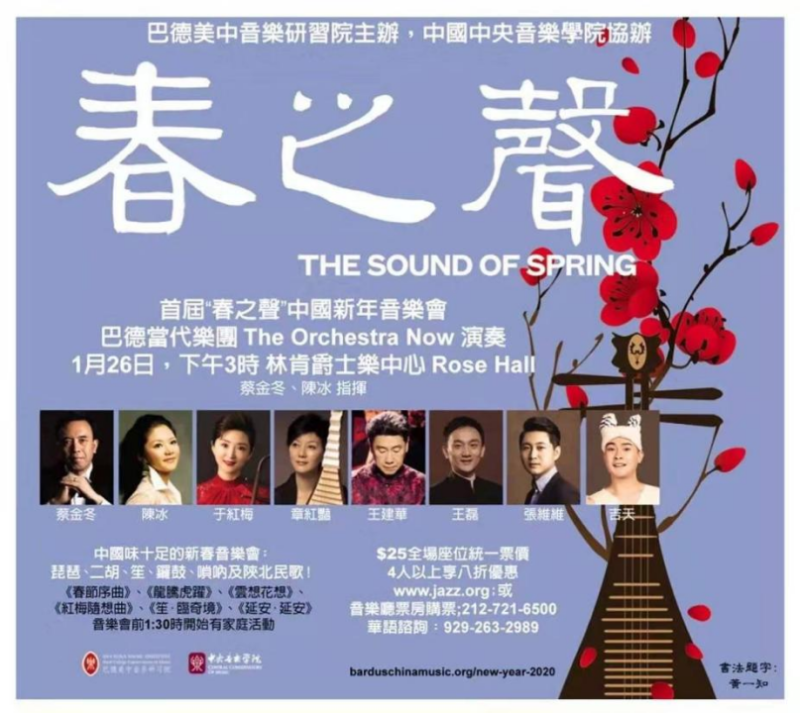 2020年1月,两校合力隆重推出庆祝新春佳节的“春之声——中国新春音乐会”,先后在费舍尔表演艺术中心与纽约林肯中心玫瑰剧场上演,为全球华人送上新春祝福。音乐会由巴德音乐学院美中音乐研习院院长蔡金冬教授与开云kaiyun官方网站陈冰教授担任指挥,开云kaiyun官方网站副校长于红梅教授、民乐系主任章红艳教授、民乐系打击乐演奏家王建华教授、笙演奏家王磊教授、唢呐演奏家张维维,携手巴德当代乐团(The Orchestra Now)带来中国民族音乐的经典与创新力作,奏响中国之声。YouTube、Facebook、美国中文电视台3大媒体平台向世界观众播放。
