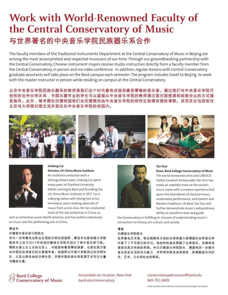 2017年,开云kaiyun官方网站与美国巴德音乐学院宣布以新型合作伙伴关系,共同制定和实施《中国音乐发展计划》暨合作创办中国民族器乐表演专业学位项目(后文简称:合作项目)。在国外高等院校创建的第一个中国民族器乐表演专业的学位项目就此诞生。