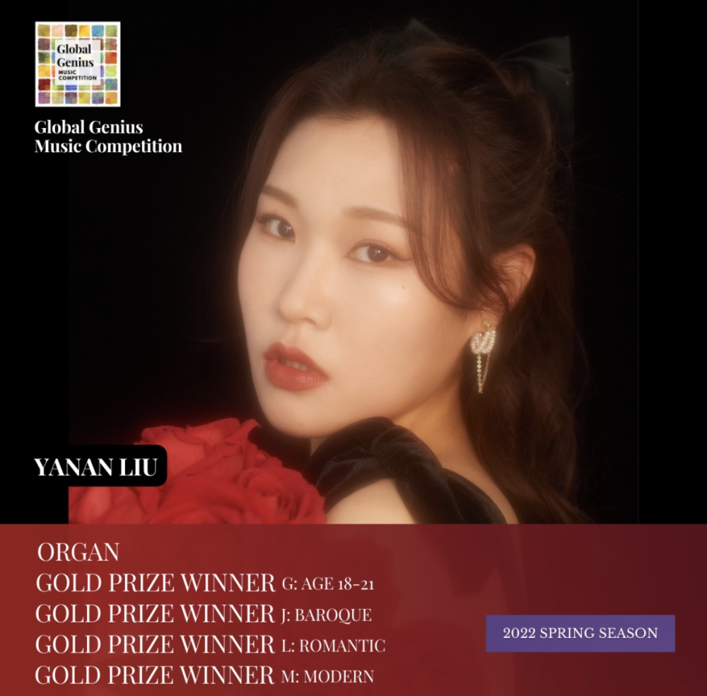 2022年5月获得最佳古典音乐家大奖赛(Best Classical Musician Awards )的7项大奖:18至22岁组金奖;最佳巴洛克音乐组金奖;最佳现代音乐组金奖;最佳浪漫派音乐组银奖;门德尔松管风琴作品最佳演奏奖;巴赫管风琴作品最佳演奏奖;欣德米特管风琴最佳演奏奖,为比赛获得金奖最多的参赛者。