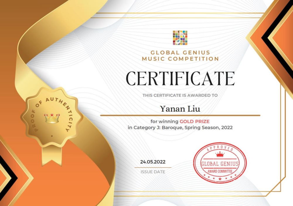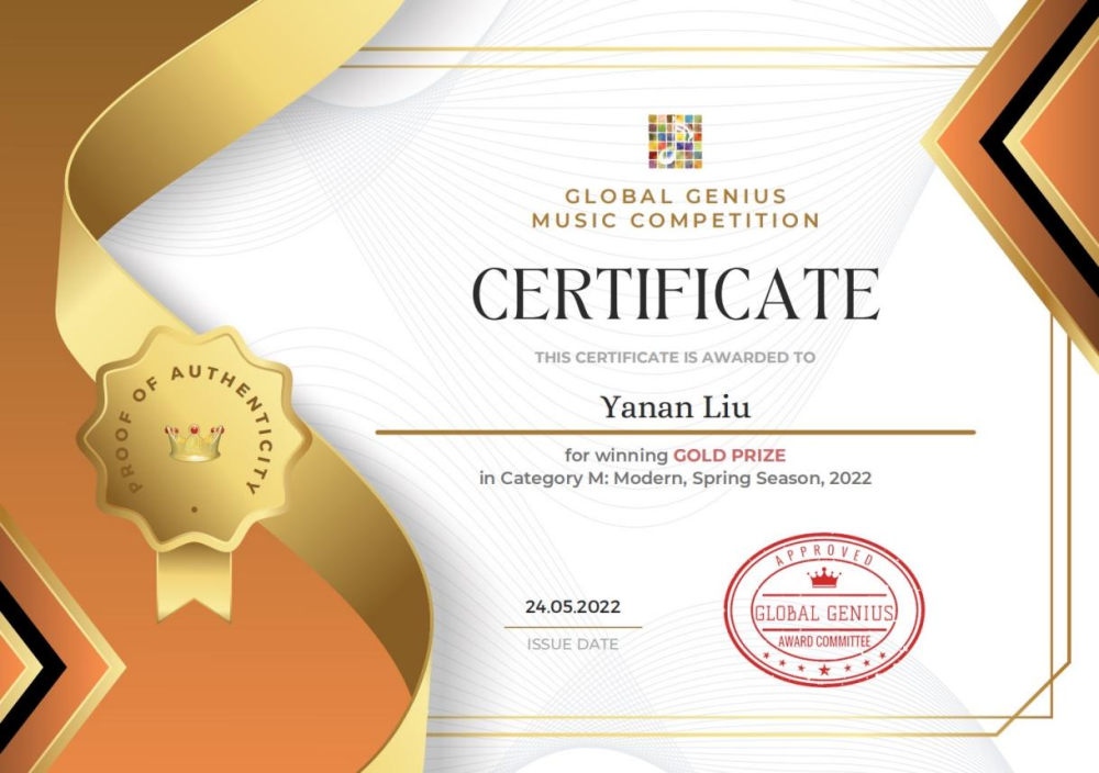 全球天才音乐家大奖赛(Global Genius Music Competition )旨在发现世界最有前途的古典音乐家,此次比赛由总部设在英国米尔顿凯恩斯全球委员会举办,评审团成员由克罗地亚萨格勒布音乐学院;土耳其阿纳多卢国家音乐学院;意大利安东尼奥维瓦尔第音乐学院;美国雪兰多艺术学院;西班牙马德里皇家音乐学院;美国罗德岛大学;英国市政厅音乐戏剧学院等教授组成。2022年春季赛季共有529名键盘选手参赛。