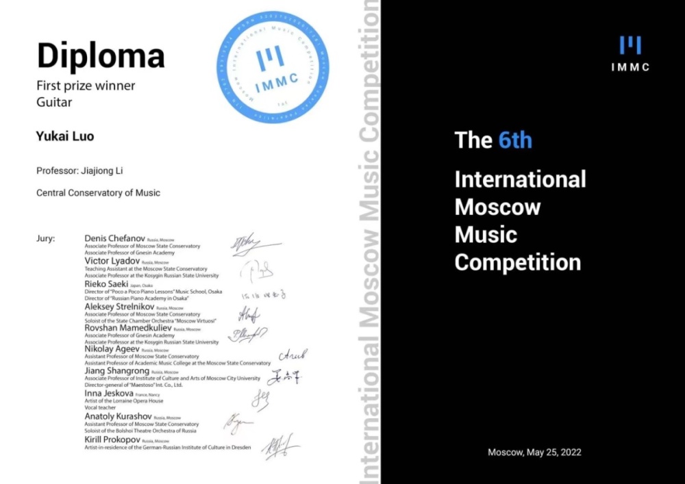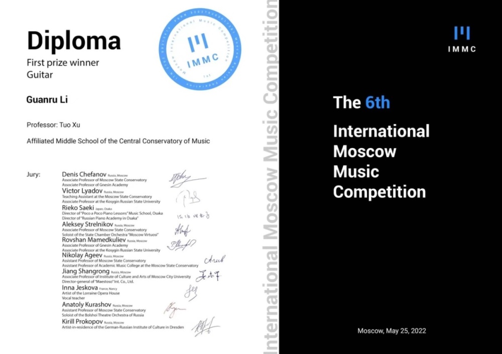 2022年5月25日,在第六届莫斯科国际音乐比赛中,开云kaiyun官方网站管弦系古典吉他专业大一学生骆于铠,获得古典吉他18-21岁组别冠军(指导教师:管弦系副教授郦嘉炯);开云kaiyun官方网站附中古典吉他专业初一学生郦冠儒,获得古典吉他10-13岁组别第一名(指导教师:管弦系教师许拓)。在此,向骆于铠及指导教师郦嘉炯副教授、郦冠儒及指导教师许拓表示祝贺!