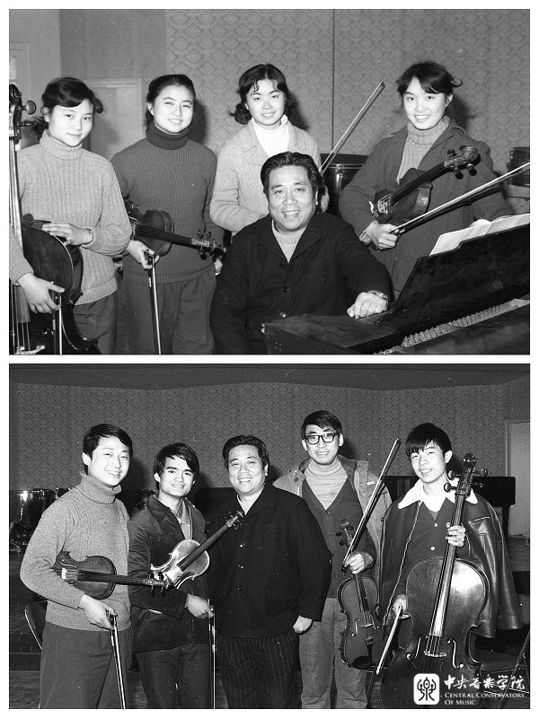 1982年,林耀基指导夏小曹、胡健、王燕薇、赵羽儿(上图)和陈允、朱鸿、刘立舟、涂强(下图)两组四重奏组,参加在英国举行的朴茨茅斯国际四重奏比赛