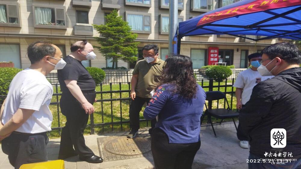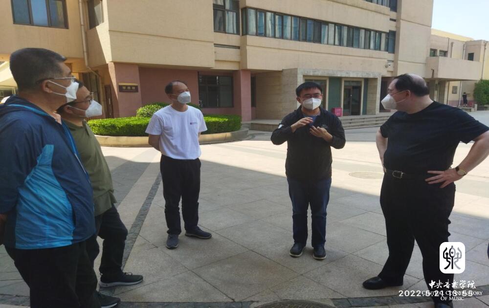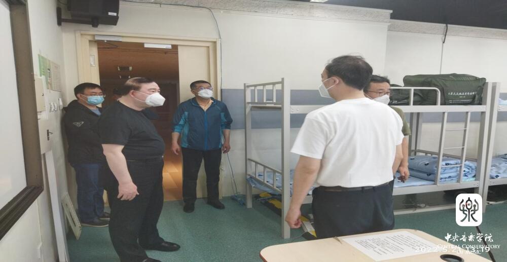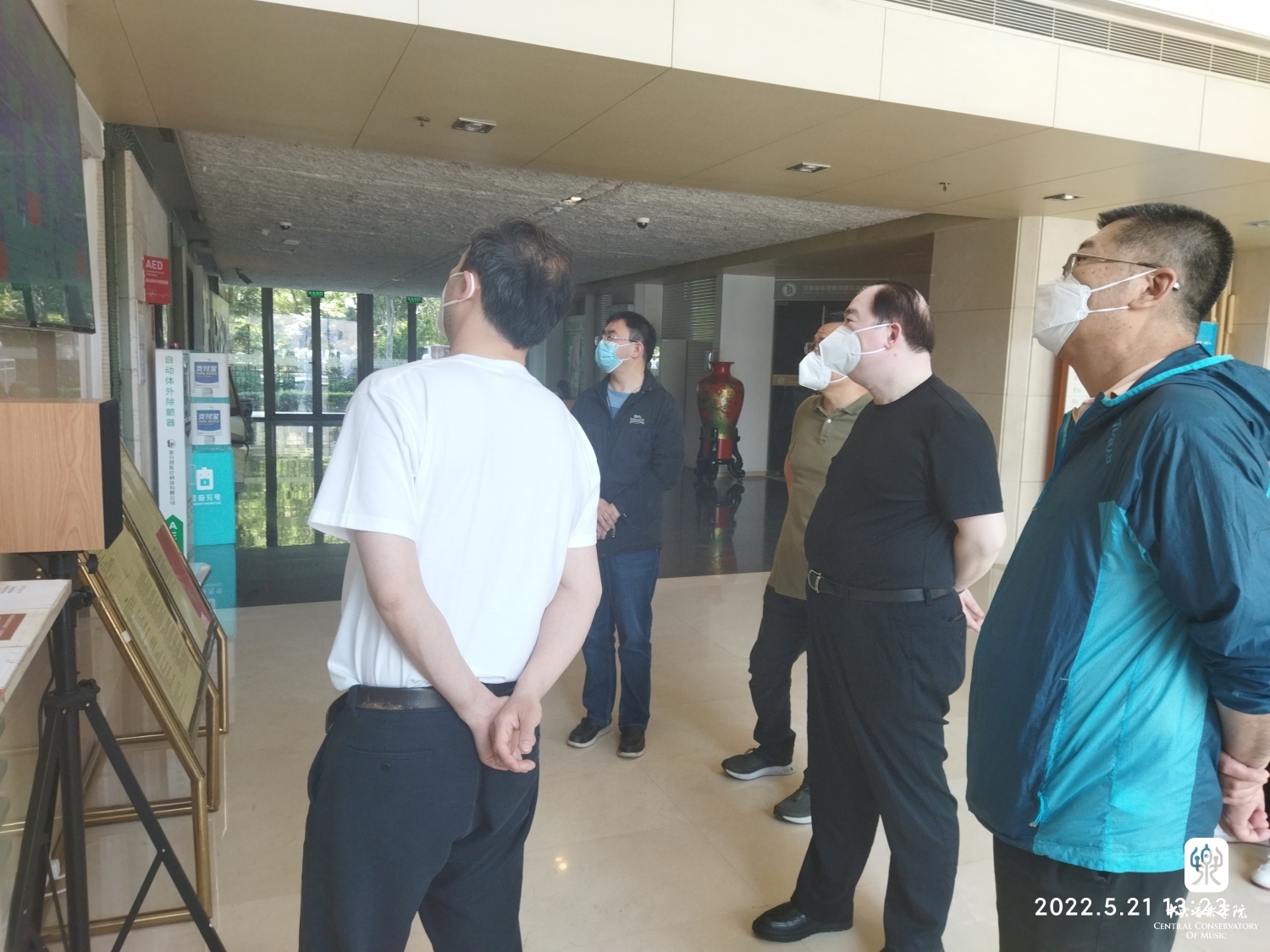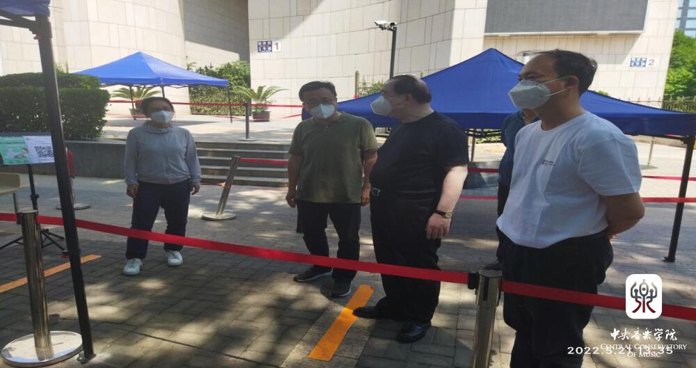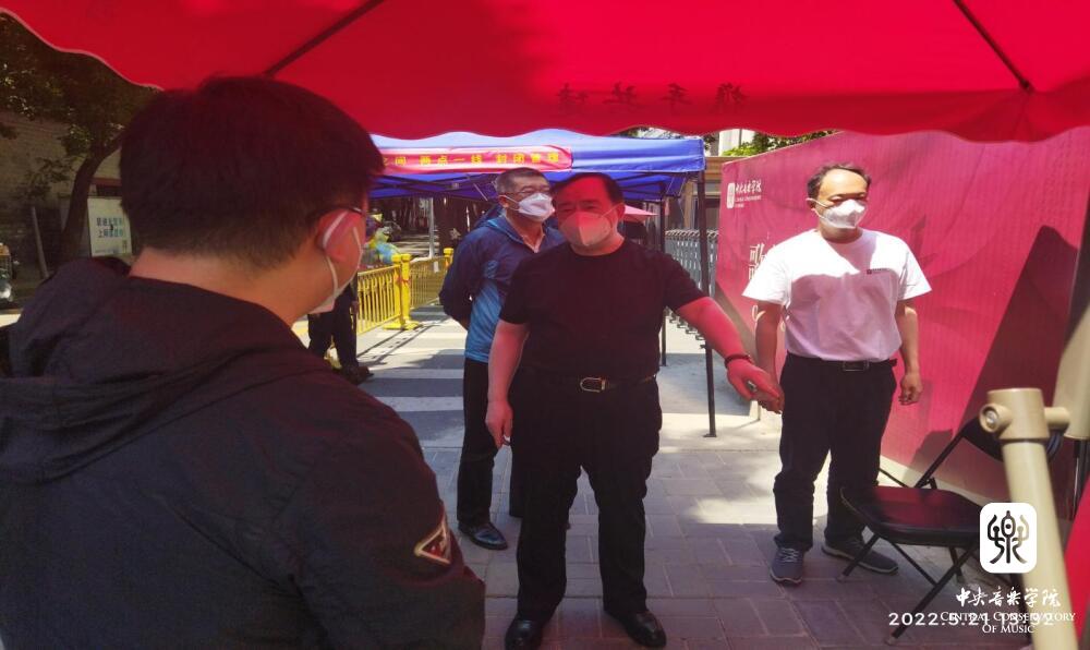 俞峰校长先后来到学校琴房楼、教学楼、筒一楼健康观察点、王府东门外学生专用通道、公寓北门、风味餐厅和核酸检测点等地,现场对校园疫情防控工作进行再检查、再部署。他在琴房楼叮嘱教务处值班老师一定要做好学生练琴保障;在教学楼二层的保安临时住宿点,他强调建管处、保卫部一定要加强对“保食洁”人员的管控,降低传播风险。