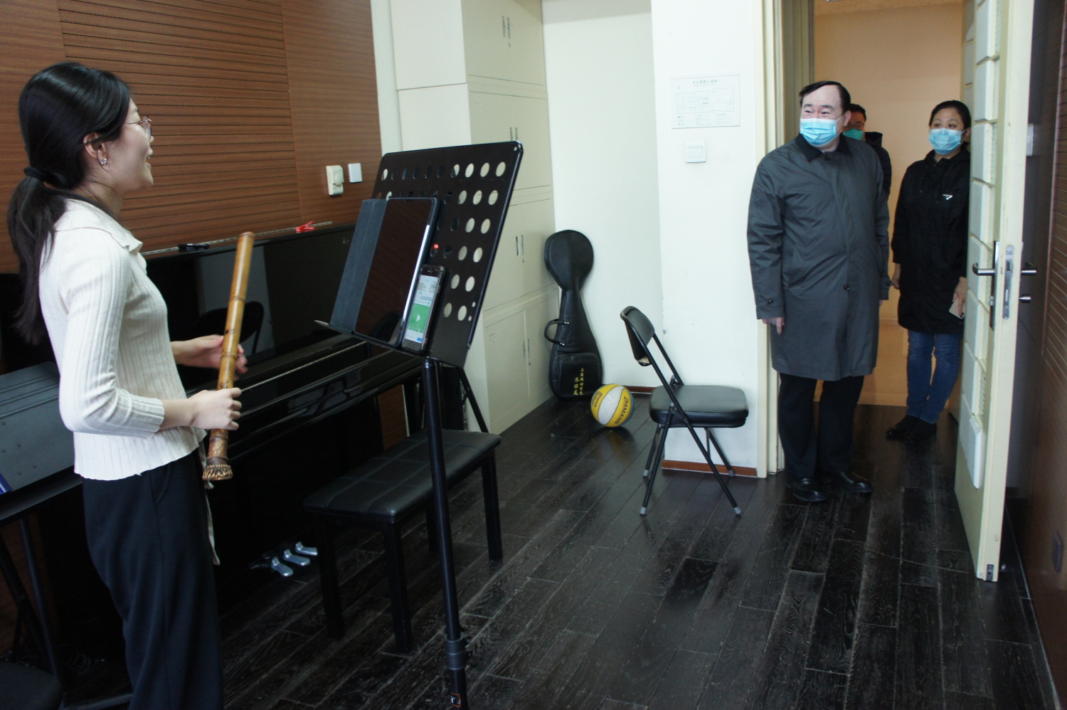俞峰校长先后来到学校教学楼、学生宿舍、食堂、超市等处进行疫情防控检查督导。在教学楼,俞校长仔细了解了楼宇出入管控、琴房使用和学生练琴情况。他在琴房与学生认真交谈,询问他们学习和生活上的困难和要求。看到同学们有的在练琴和上专业课,有的在上思政课,观看庆祝中国共产主义青年团成立100周年大会实况转播,大家都在安心和认真地学习,俞校长感到非常欣慰和高兴,嘱咐同学们克服暂时的困难,努力学习,提高自己的专业水平,同时保持好良好的心态和学习的热情。