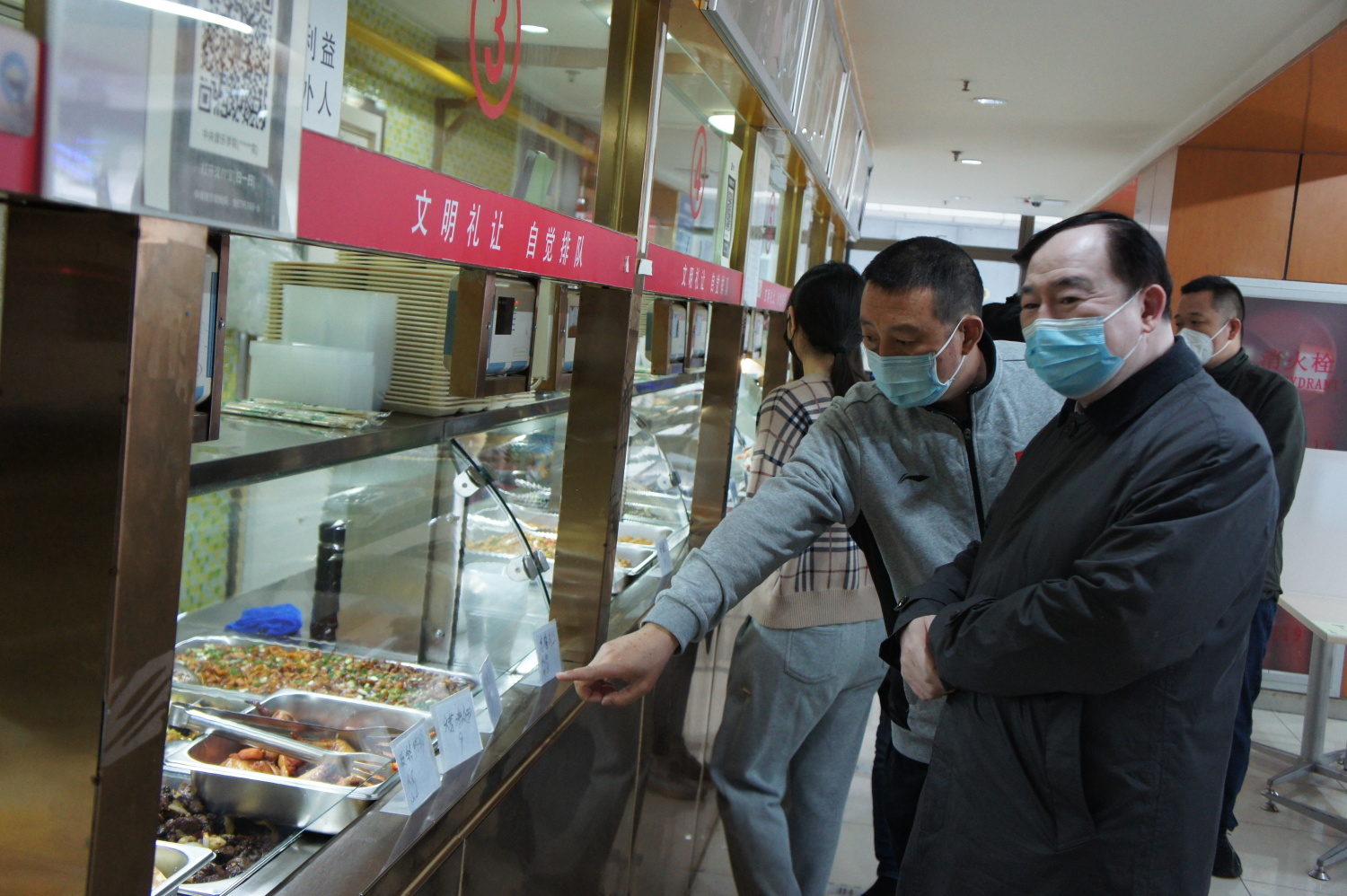 在学生食堂,他查看了当天饭菜,向食堂工作人员了解疫苗接种和核酸检测情况,要求饮食部门要努力保障好同学安全和疫情期间饭菜合口。他还来到KC超市和洗衣房,希望他们协助学校积极落实好疫情期间食品和物资保障工作。