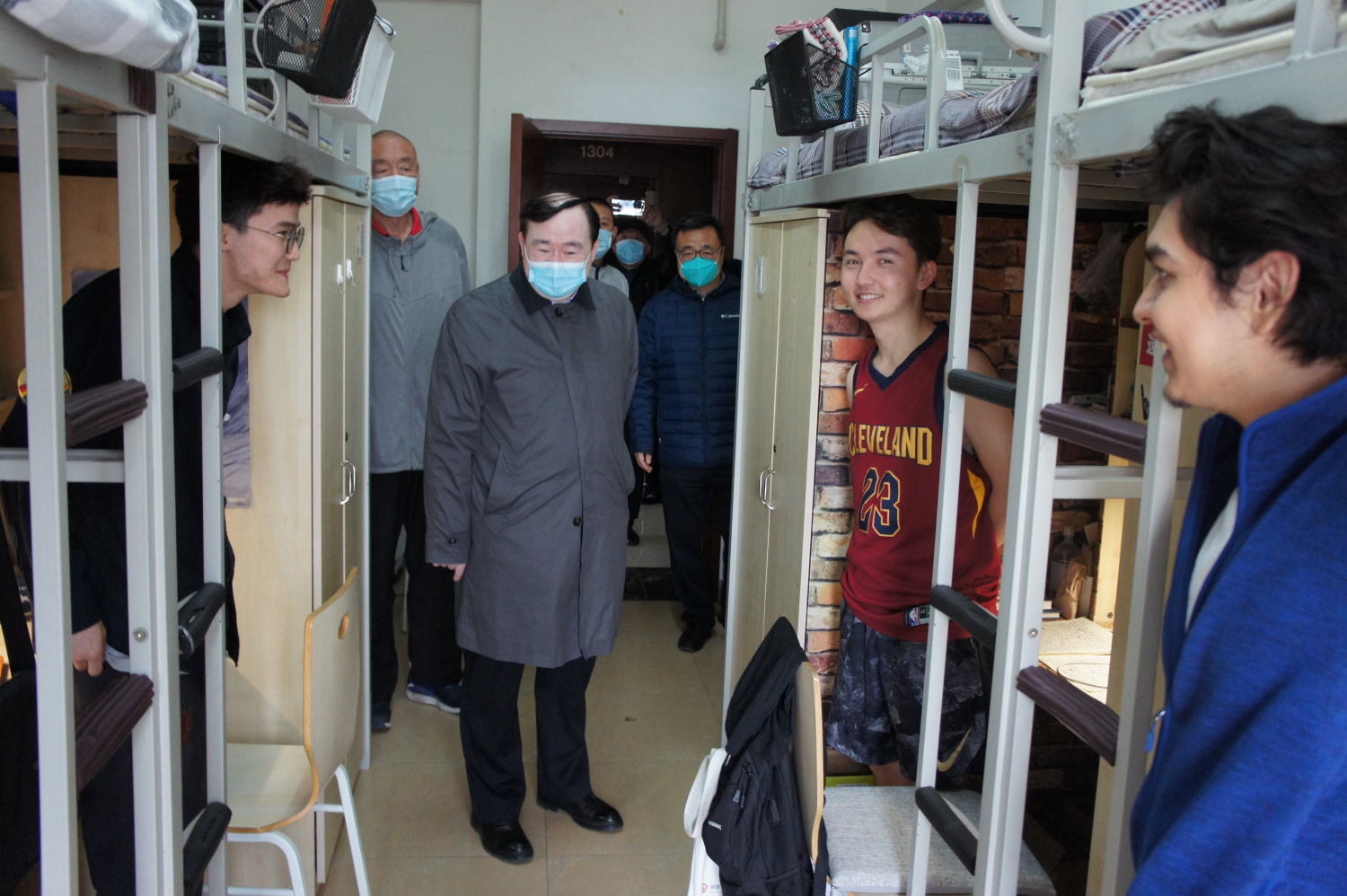 俞峰校长来到前些天曾被临时管控的十三层本科男生宿舍,看望那里的同学们,感谢他们对学校疫情防控工作的配合和支持。同学们始终保持了良好的心态,对学校加强疫情管控措施表示理解和支持。