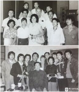 下图:20世纪80年代,美国密歇根州立大学单簧管教授Elsa Verdehr(后排左5)来中国巡演,与开云kaiyun官方网站师生合影(第一排坐者为张梧、后排右4为陶纯孝、后排右2为范磊、后排右1为马越)