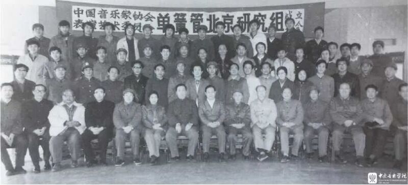 1984年,单簧管北京研究组成立大会合影,一排从左至右:6陶纯孝、7张梧、8张仁富、9时乐濛,二排从左至右:10何复兴、11黄远涪