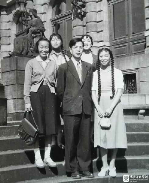1959年,参加第七届世界青年联欢节国际比赛的中国代表队合影,后排从左至右:1盛明尧、2刘少力、3张仁富、4鲍蕙荞、6殷承宗,前排左2为陶纯孝