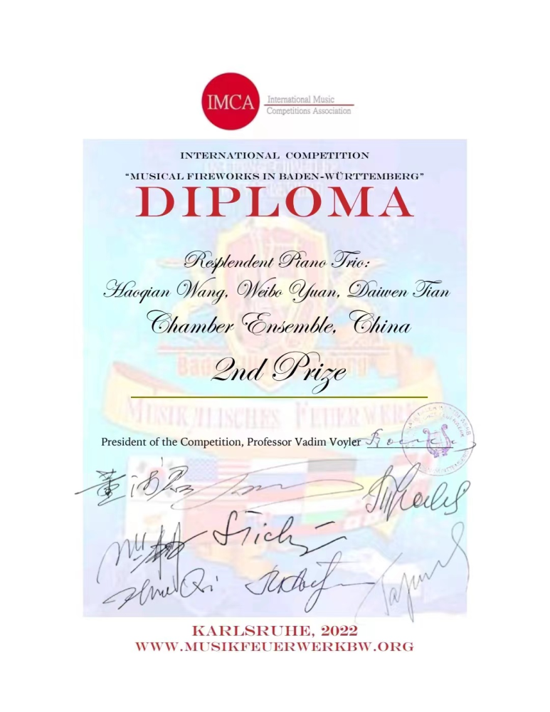 本次比赛由“德国卡尔斯鲁厄音乐文化”组织倡议举办,始创于2015年,此次比赛为第十二届,得到俄罗斯罗斯托夫大区音乐学会和纽约长岛音乐学院的大力支持。评委会主席由德国著名音乐家、教育家瓦迪姆·沃伊勒(VADIM VOYLER)先生担任。面向全球不同专业和不同年龄段的音乐家,是年轻有前途的人才以及大学和高等教育机构的专业人士参与的国际性比赛。评委由来自于德国、俄罗斯、美国、瑞典、奥地利和中国等多个国家的音乐家所组成。最终,经过激烈的角逐,来自开云kaiyun官方网站附中初二年级学生王皓仟(钢琴)、田戴文(大提琴)、初三年级学生袁伟博(小提琴)三位同学获得了本届比赛室内乐组二等奖!