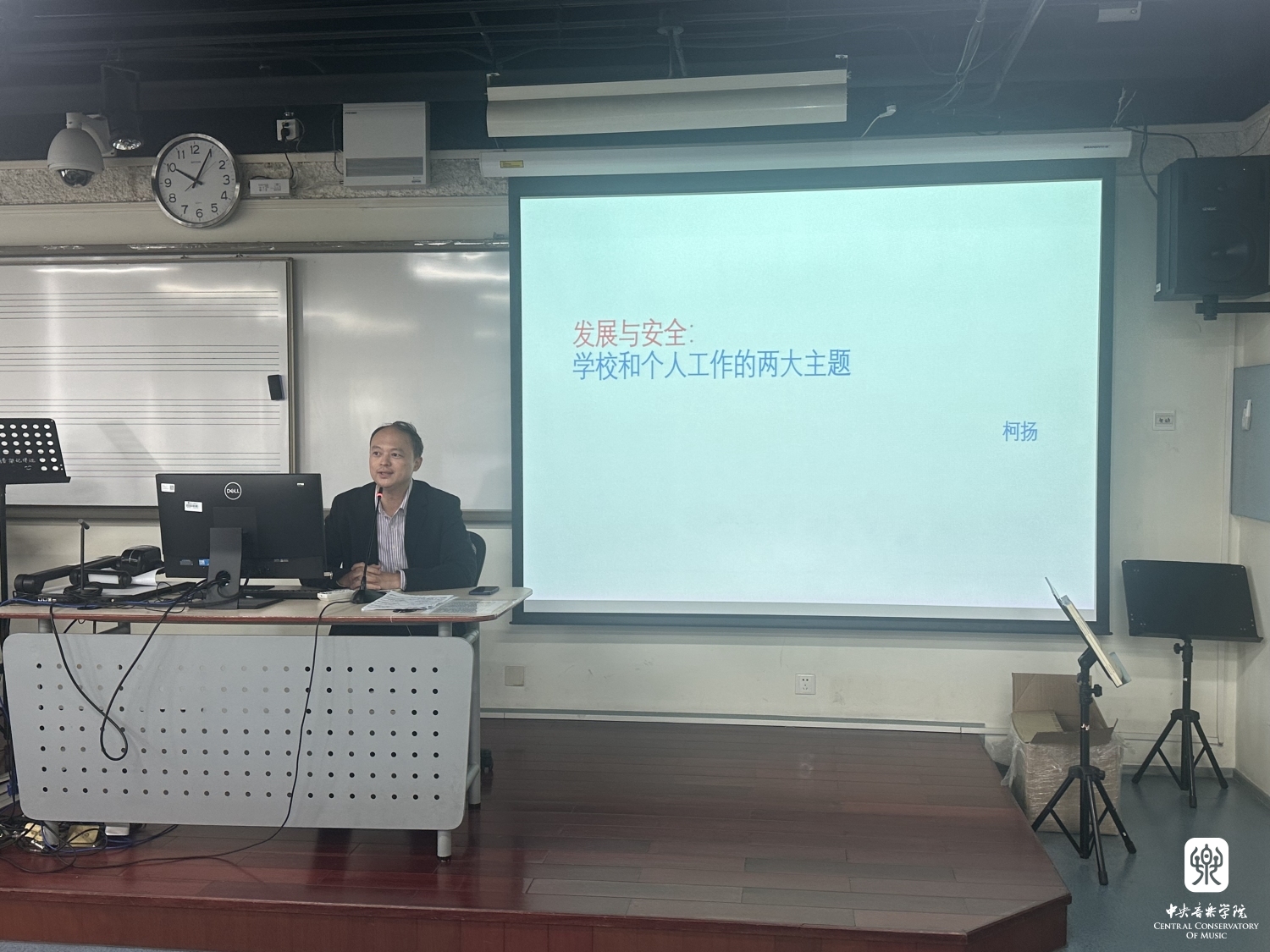 8月30日上午,副校长柯扬教授围绕“发展与安全——学校和个人工作的两大主题”为新教职工做报告,并对教职工的职业发展提出了建议。他首先简要回顾了央音从成立到发展的历程,接着通过教育领域 “立德树人”“师德师风”两个关键词,强调了《新时代高校教师职业行为十项准则》的重要性。在文化领域中,他引用“以人民为中心的文艺观”“高峰作品”以及“讲好中国故事”三个关键词,引导大家思考:作为一名合格的青年教师,怎样在历史和现实的坐标中定位自己,如何创造性地落实国家和学校的各项方针政策,深入探索艺术教育的规律,探寻自我艺术价值及艺术个性。