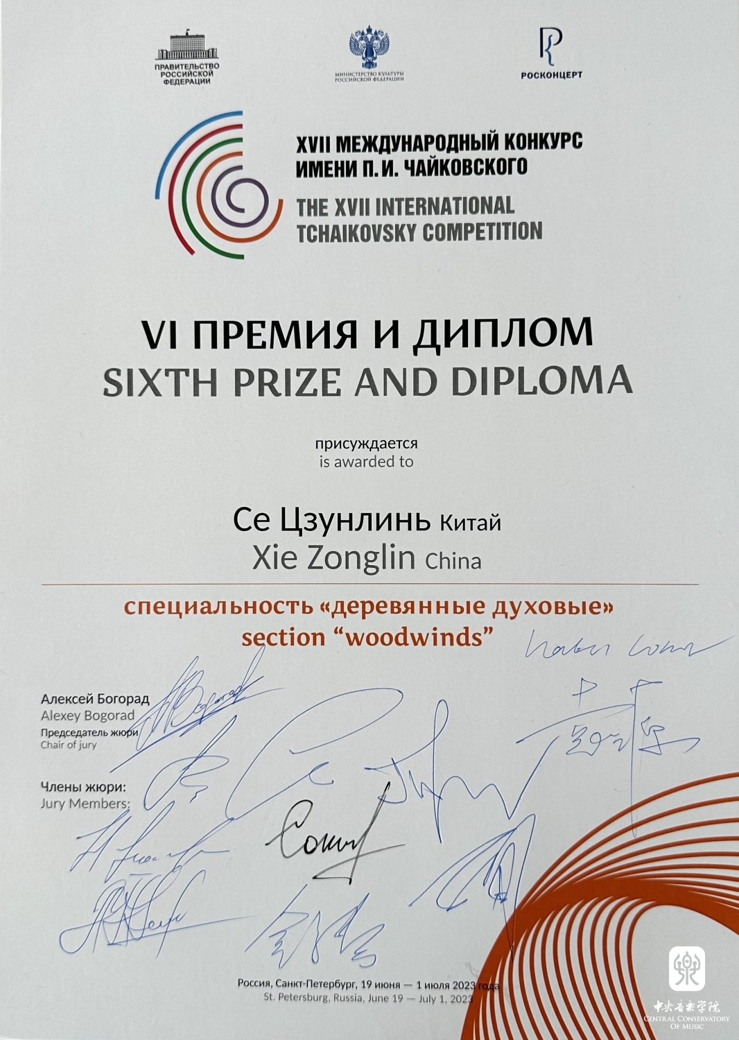 “接到柴可夫斯基比赛预选通过的消息,离出发圣彼得堡只剩短短半个月左右,在这么短的时间内需要同时练三轮的九首曲目,并达到心中的高质量,对我来说是一个不小的挑战,我感到了前所未有的压力。在此同时,学校、我的老师袁源教授和师哥师姐们给予我及时的指导和帮助,让我充满了信心和动力。到达俄罗斯之后,历经十几天的奔波和比赛,让我有机会近距离倾听了来自各个职业乐团的木管声部首席以及世界顶级音乐家的演奏。我在前两轮很好地发挥出了自己的水平,但由于比赛经验上的不足,决赛中没有更完美的表现,给我留下了深深的遗憾。感谢学校在比赛期间为我们提供了充分的支持和保护,感谢袁老师多年来在专业教学上的悉心指导,感谢柴赛的舞台让我圆梦。不同的音乐以及文化的碰撞让我迅速成长,也重新认识了自己。当主持人念到我的名字时,后面跟着的那句“from China”让我感到无比骄傲。同时,祝贺中国音乐家们在本届比赛上取得的优异成绩,这次宝贵的比赛是我人生中非常难忘的经历。”