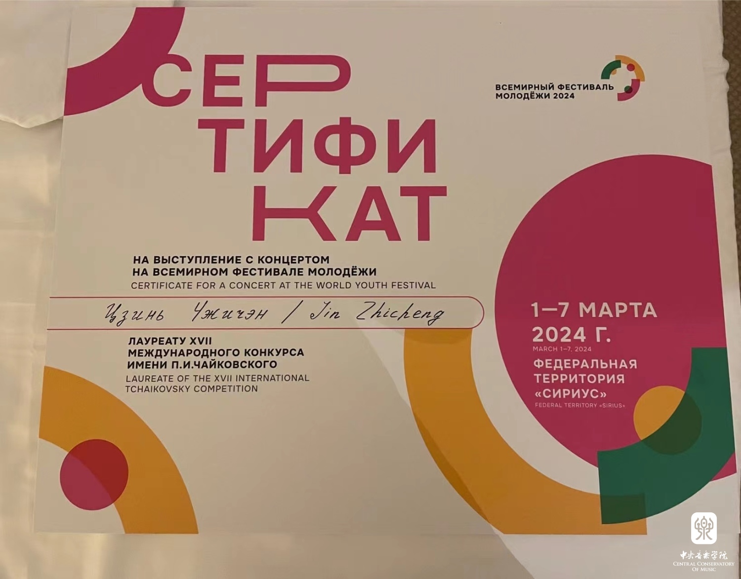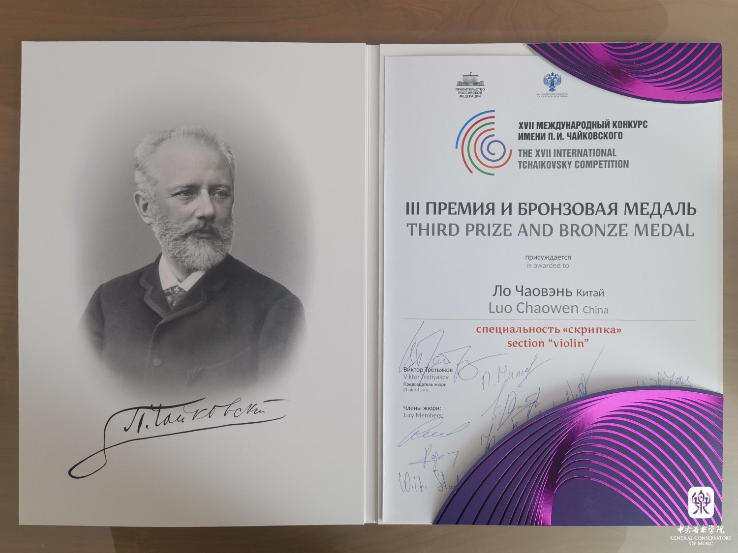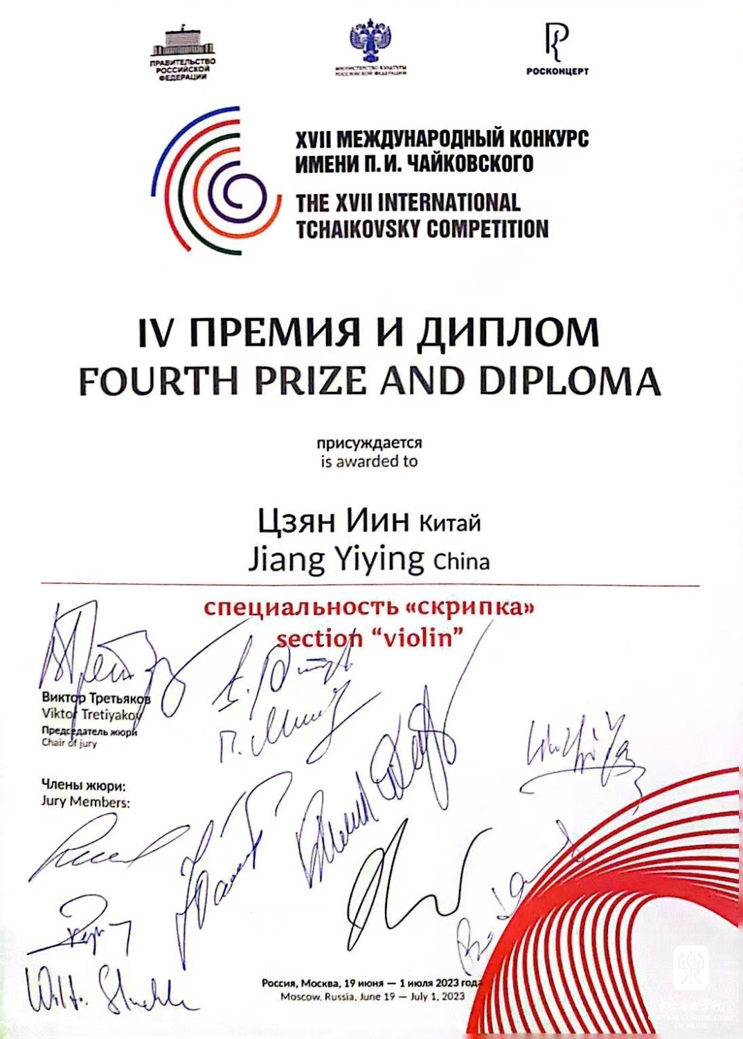 “这次在柴可夫斯基国际音乐比赛小提琴组中获得第四名的成绩,我感到非常激动与自豪!柴赛可以说是音乐界的奥运会,是音乐圈的顶级赛事!可想而知,它的曲目分量也是相当大和重的,而不太幸运的是很多曲目我以前并没有拉过,巴赫赋格以及庞大的柴可夫斯基小提琴协奏曲,在公布初选名单到正赛极短的时间内,从背谱到展现音乐,对我来说都是极大的挑战!但我极其幸运,学院、管弦系、小提琴教研室都给予我们最大支持!俞院长赛前在动员会上振奋人心的讲话几乎使我们每一位选手深受鼓舞,热血澎湃地想要在柴赛舞台上一展我们中国人的风采!系里和教研室提供了多次让我们赛前走台的机会,每一次走台都是一次宝贵的经历,让我们攒够经验再在柴赛上享受舞台!同时,我的主科老师张提教授和钢琴艺术指导老师吴琼副教授在赛前每天都在帮助我练琴、走台,细致到每个音的音准、音色!张老师还在有着时差的情况下,在我比赛期间视频听我练琴、上课,并且由于我有腱鞘炎,比赛期间左手感到不适,无法练习太多,于是张老师不仅给我细致地讲每个音,还拿起琴示范几乎一整首协奏曲,我深受感动和鼓舞!在莫斯科每一轮在音乐厅走台的录像张老师都会细细地从头到尾给我讲一遍我的所有问题,并帮助我将其解决。张老师在比赛心理心态上也对我有着极大的影响与帮助,赛前的鼓励与肯定,使我可以更加自信地站在柴赛的舞台!吴老师更是不辞辛苦地陪我一起去莫斯科为我弹前两轮的比赛,在比赛场地走台时帮助我听演奏与音乐厅声音之间的关系,不断录音、看谱子找问题并改正!吴老师不仅在比赛上给予最大支持与帮助,还在生活上对我们学校的四位学生非常照顾,是我们的坚实后盾!