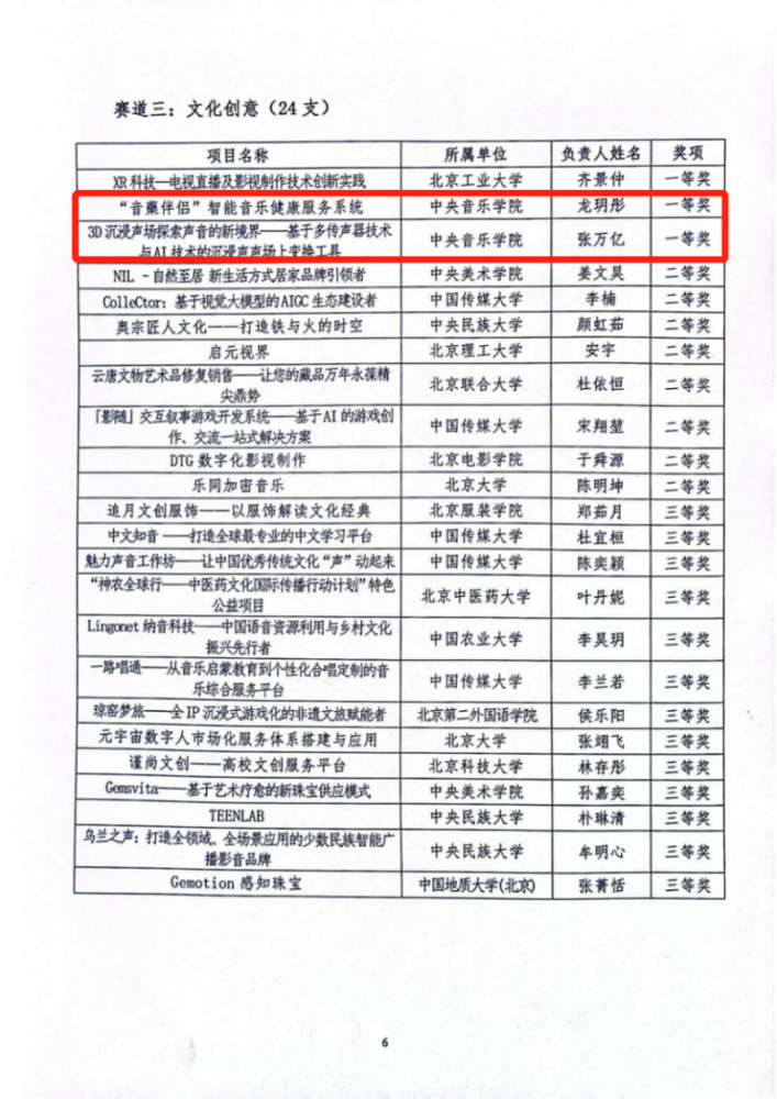 近日,北京市教育委员会、北京高校大学生就业创业中心公布了第二届“京彩大创”北京大学生创新创业大赛分赛道现场决赛获奖名单,经过前期项目孵化、学校推荐报名、市级网评初赛、市级网评复赛、市级分赛道现场决赛,开云官网2个参赛项目《“音藥伴侣”智能音乐健康服务系统》(负责人:龙玥彤<2022 级音乐学系硕士>,指导老师:姚越,团队成员:王郁尧<2022 级音乐学系硕士>、毕潇丹<2022 级音乐学系硕士>、杨瑞<2021 级作曲系博士>、王一然<2022 级音乐学系硕士>、苏家兴< 清华大学在读硕士>、王译晗< 墨尔本大学在读硕士>、Xuyuan Cai< 加州大学圣克鲁斯分校在读硕士>)和《3D沉浸声场探索声音的新境界——基于多传声器技术与AI技术的沉浸声声场上变换工具》(负责人:张万亿<2022 级音乐人工智能与音乐信息科技系硕士>,指导老师:李小兵、朱诗家,团队成员:钱轶恺<2021 级音乐人工智能与音乐信息科技系博士>、李志尚< 首都师范大学在读本科>、张海桦< 首都师范大学在读本科>)分别获得文化创意赛道一等奖。