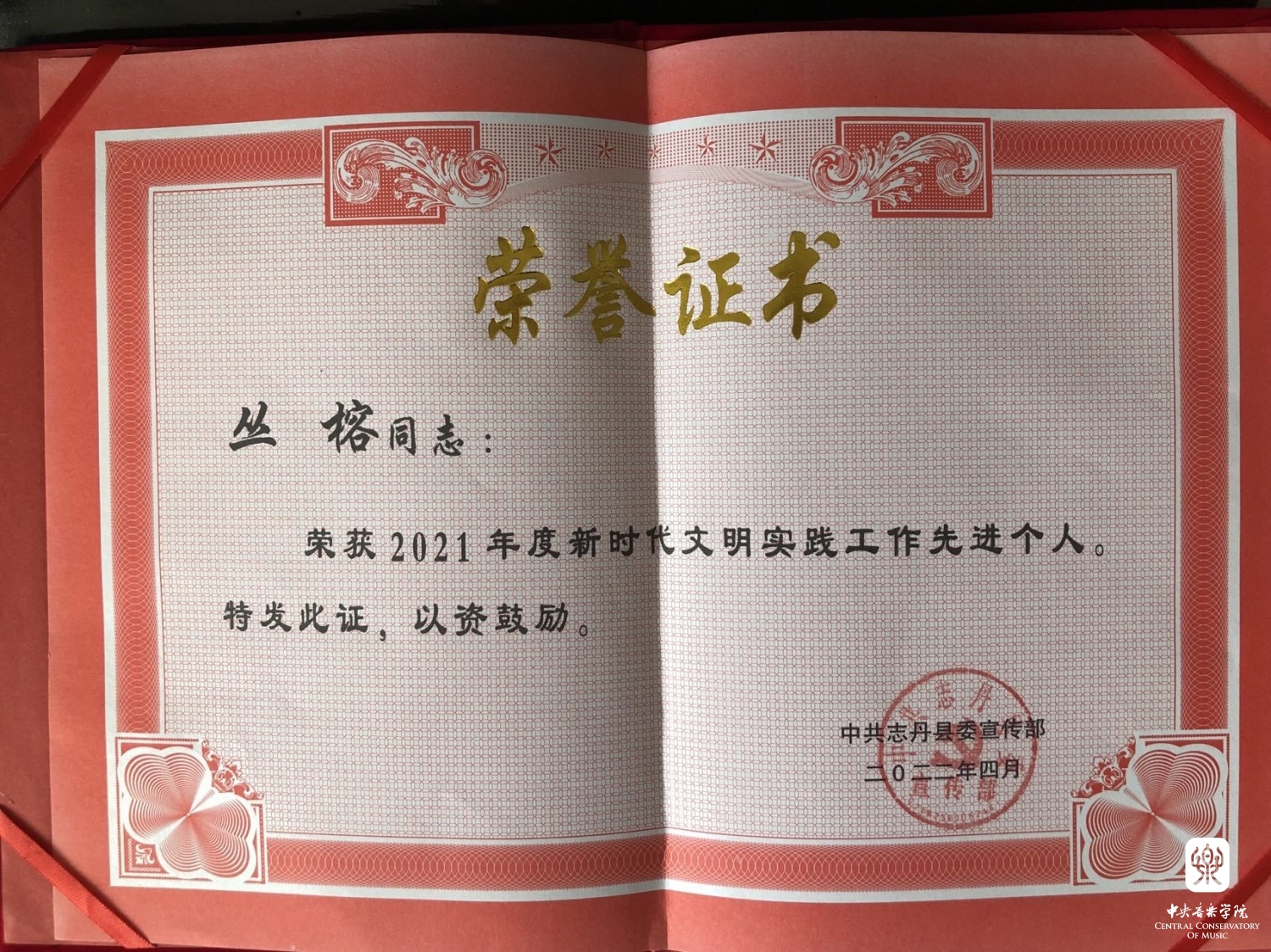 “感谢彼时的我,在两年前的那一刻留下来,去接受、改变将经历的一切,从而造就了现在的我。记得俞峰院长在启程前对我和同伴们说过一句话,“人的价值在于被需要”。我由衷地感到幸运,在学校得到最好的教育资源,走出学校又踏上了最真实广袤的大地,找到自身被需要的价值。希望更多高校各个领域的人才都能加入进来,在志愿服务中了解祖国、了解人民,用所学所长在工作中找到服务社会的道路;我愿终其一生都能作促进教育公平、文化共享的桥梁,成为以文化人、以文育人的一砖一瓦,使文艺为人民所用,做祖国文化事业的奠基者;我愿每一个“最后一公里”都能种下艺术的种子,每一个人都得到追求美、欣赏美、创造美的机会与能力,我们共同努力,为祖国装点一个更加灿烂的未来。”