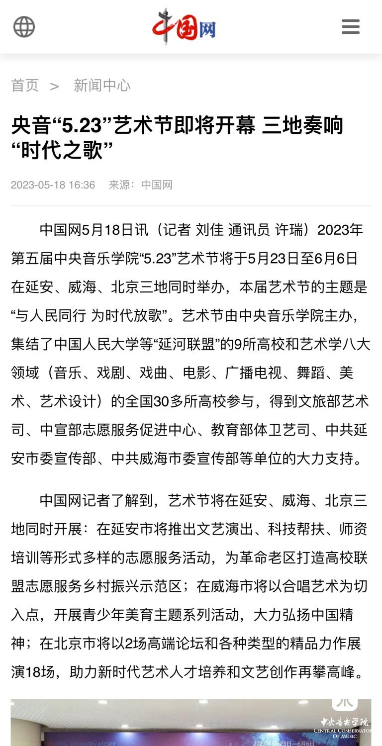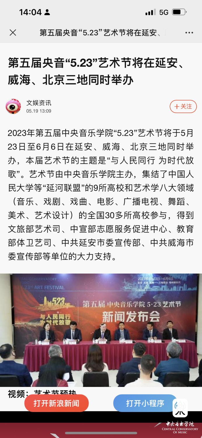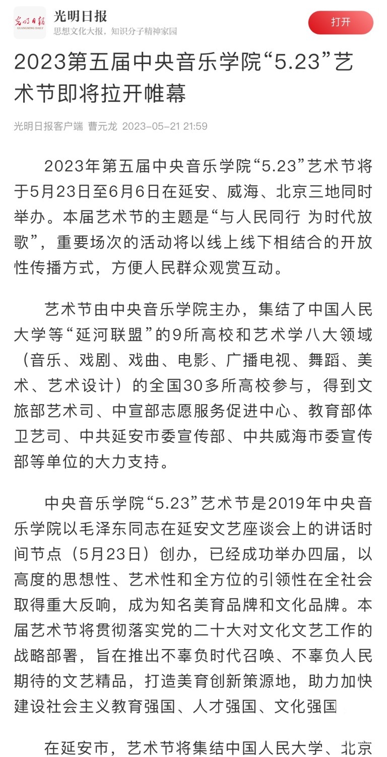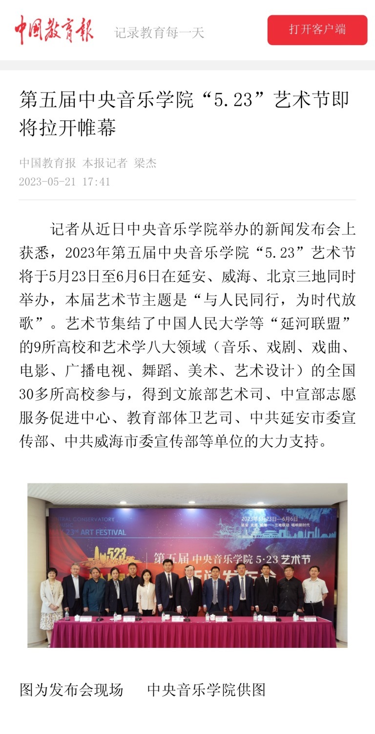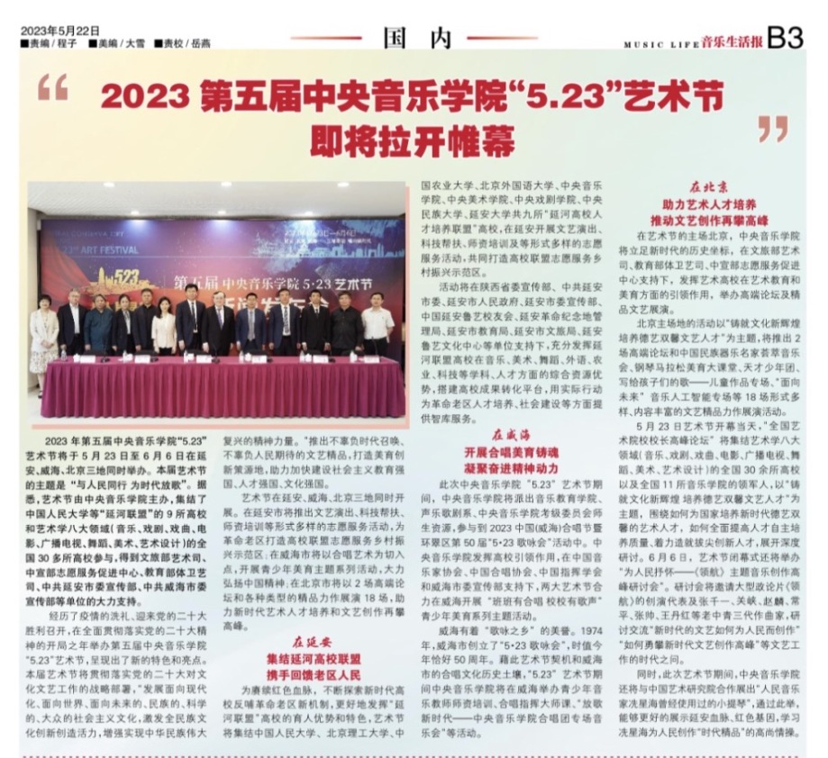为期两周的第五届开云kaiyun官方网站“5.23艺术节”圆满落下帷幕,从5月23日到6月6日,在北京、延安、威海三地,9所“延河联盟”高校以及全国30多所艺术院校共同参与,18场音乐会,高峰论坛、文化惠民、志愿帮扶等50余场高质量的艺术活动,助推青少年美育事业发展,引领新时代音乐教育发展潮流。本次艺术节紧紧围绕“以人民中心”的主题,策划出品了“钢琴马拉松——美育大课堂”、“写给孩子们的歌——儿童专场音乐会”、“面向未来——音乐人工智能音乐会”、”人民音乐家冼星海提琴珍藏展”等各具特色的音乐活动,既是一次很好的开云kaiyun官方网站教学成果展示,更是学校师生服务社会艺术实践的重要平台,为喜爱音乐的朋友们和孩子们带来了一场音乐盛宴。