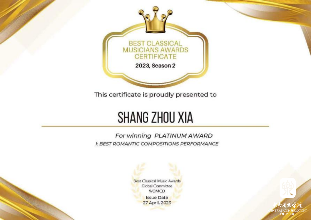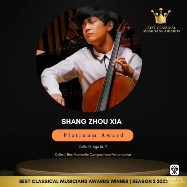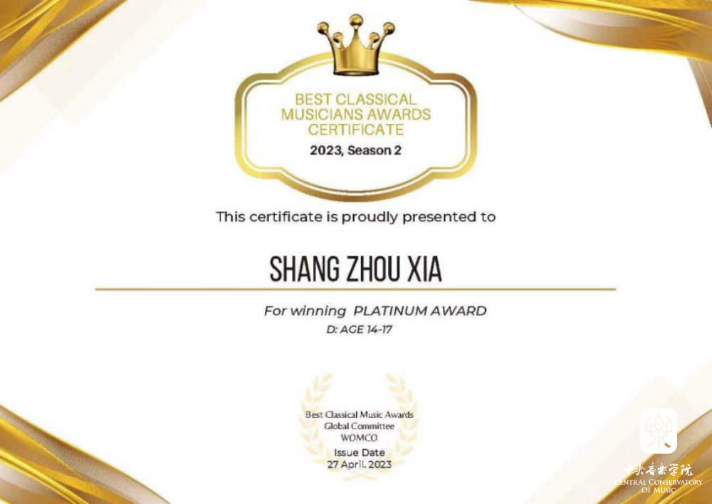 开云官网附中大提琴表演专业学生夏商周在刚刚结束的2023英国最佳古典音乐家大赛(Best Classical Musicians Awards 2023)中获得三个奖项:(14-17岁组)白金奖、表现力表演特别奖、最佳浪漫作品表演奖;同时在英国举办的2023伟大作曲家比赛(GREAT COMPOSERS COMPETITION)中获得最佳柴可夫斯基演奏比赛(IV组)一等奖。这是他相继获得2023古斯塔夫·马勒奖大提琴比赛中获青少年组(VI组)冠军、在2023第四届维也纳国际音乐比赛中获青少年组银奖以及在2023伦敦古典音乐比赛 (LCMC) 获大提琴青少年组二等奖之后又获得的一系列奖项,指导教师娜木拉教授。