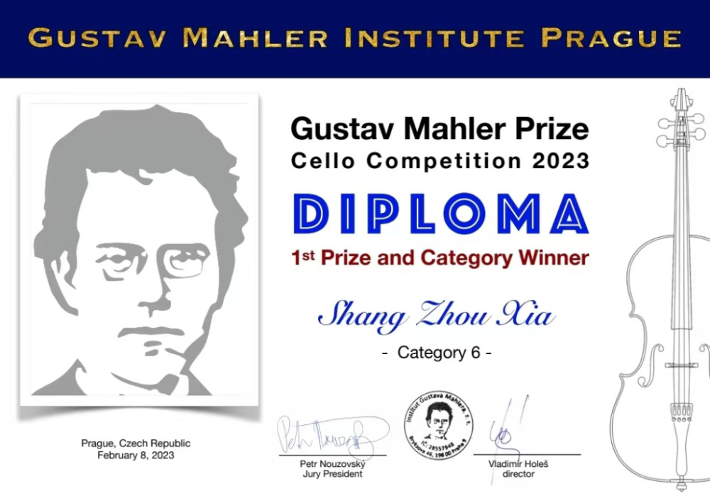 2023捷克古斯塔夫·马勒奖大提琴比赛青少年组(VI组)冠军;